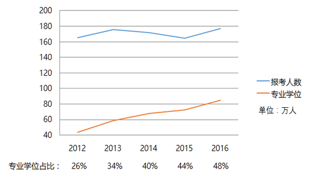 根据北京教育考试院的数据,今年报考北京院校的专业硕士学位的人数占到了52.2%,首次超过学术硕士。有两方面的原因:一是:近年来国家一直在大力扶植专业学位,招生人数上向专业学位倾斜。二是: 经过多年的发展,考生对专业学位的认可度也在上升。